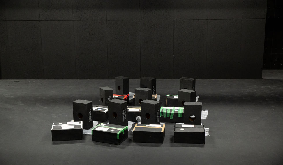 今日届いた3個と倉庫に保管していた7個を舞台上に運ぶ。しばらく眺めたあと、事務所でお借りしたカッターで封を開け、箱馬を一つ一つ取り出していく。梱包のテープの種類や貼り方になんとなく個性が見えたが、中にスッポリ納まっている箱馬は三週間前のそれと何も変わらない。もはや7月に発送してから一度も開封されずにそのまま送り返されてきたんじゃないか。しかしそれぞれ入っていた箱と並べてみると、箱馬一つ一つどこか違った雰囲気を帯びているようにも感じる。外見上の変化はないが、箱馬の中の空洞がそれぞれ別の何かによって埋められ、箱馬が内側から書き換えられているような。ある箱馬の丸穴の中を覗くと、丁寧に梱包された「出雲そば」と対面した。箱馬の中に忍ばせていたいくつかの〈おまけ〉が、取り出されることなく箱馬と一緒に返ってきていた。このとき初めて、劇場に箱馬が返ってきたというより、家から箱馬が送られてきたように思えて、時間の蓄積と空間の奥行きを感じたのだった。